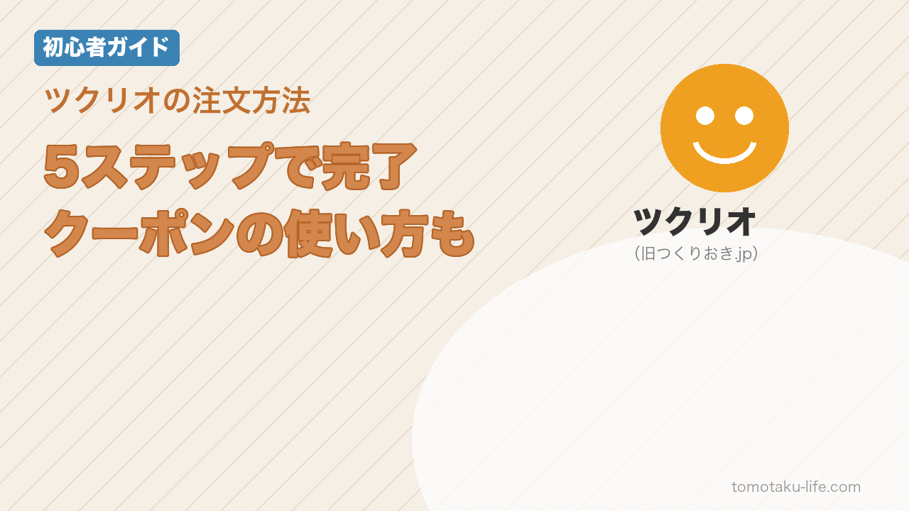 「ツクリオ(旧つくりおき.jp)の注文方法がわからない」「初めてでも簡単にできる?」——ツクリオの注文手順を画面の流れに沿ってステップ解説します。初回クーポンの使い方、プラン選び、配送日時の設定まで、迷うポイントをすべてカバーしました。