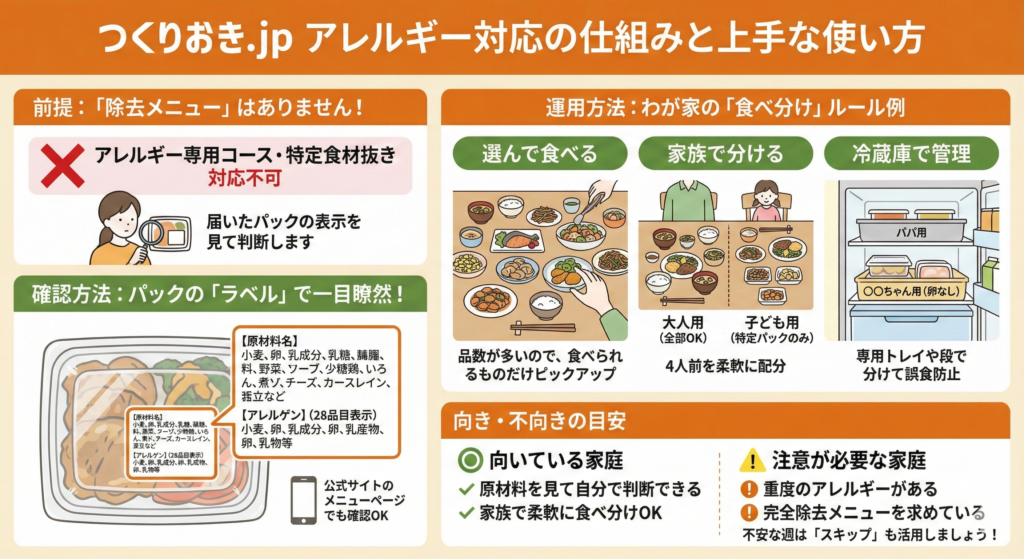 最初に押さえておきたいのは、つくりおき.jpにはアレルギー専用の除去メニューやコースはないという点です。